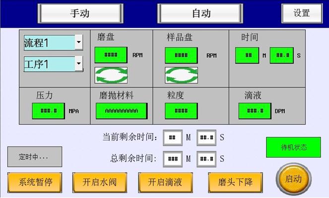 2) 單工序模式:根據(jù)每一步磨拋工序,可設(shè)置和調(diào)用30種工序參數(shù):磨盤和磨頭轉(zhuǎn)動(dòng)速度、磨拋時(shí)間、水通斷……